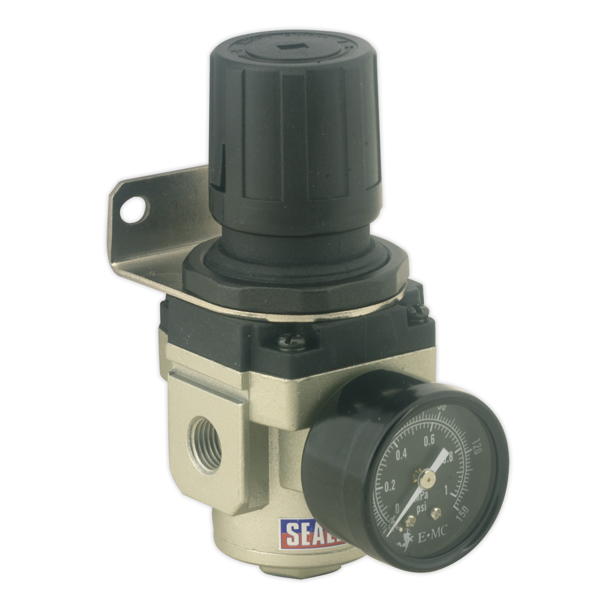 • Features locking control knob for presetting air pressure and pressure gauge.