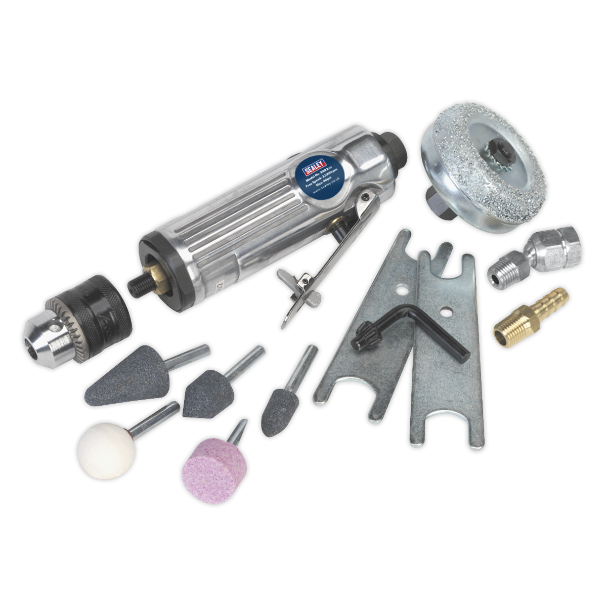 • Aluminium cased air motor with selection of Ø6mm-shanked grinding points, 10mm chuck and tyre buffing cone.