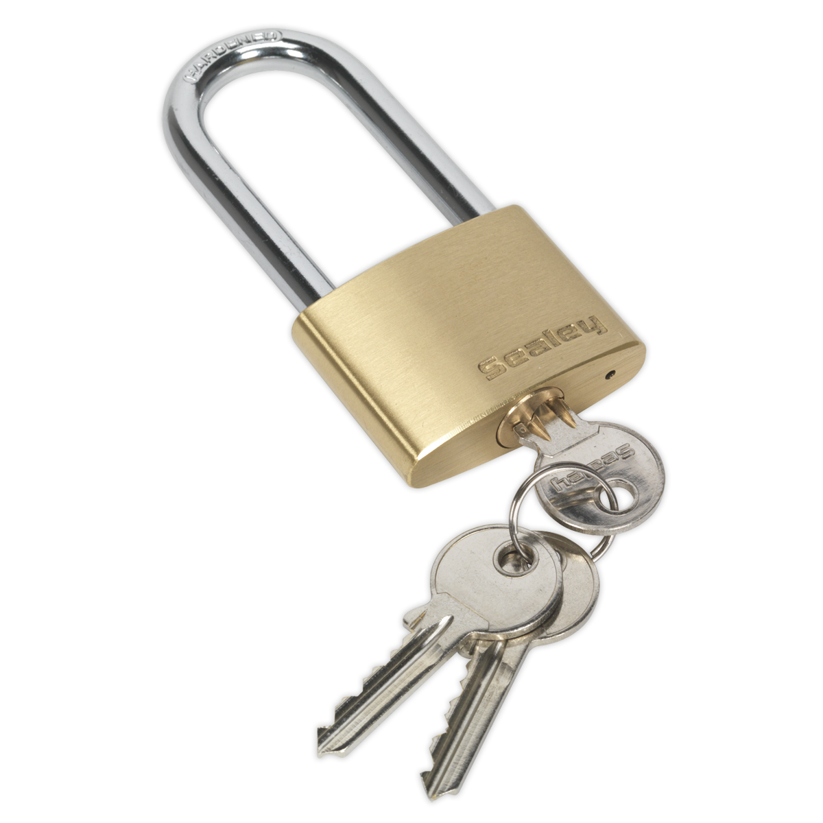 • Key operated padlock with corrosion resistant brass body and hardened steel long shackle.