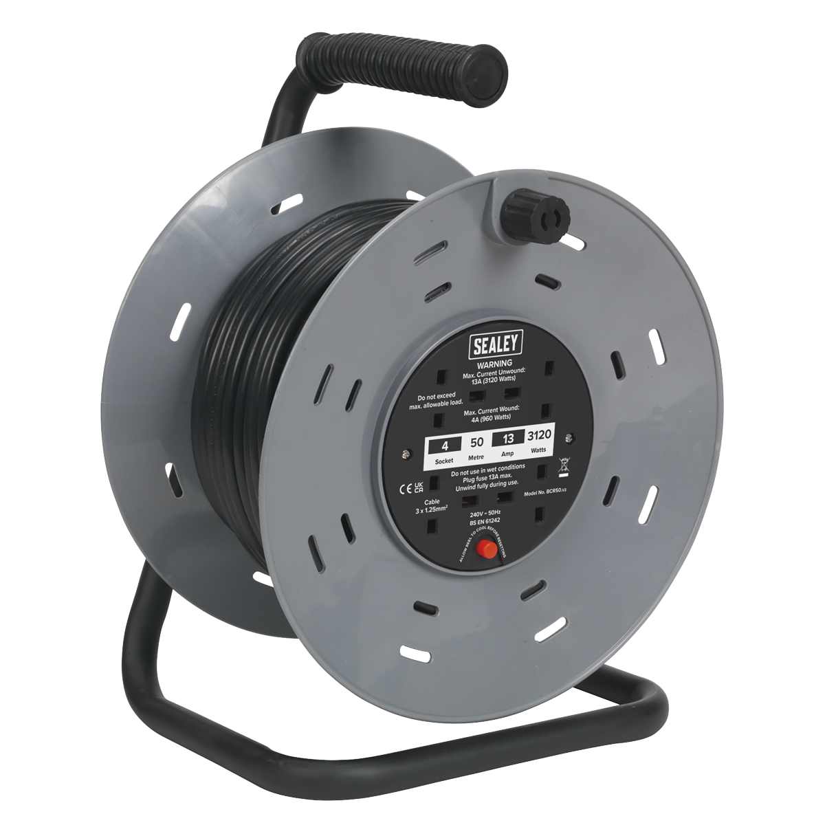 • Durable composite drum on steel stand with 4 x 230V sockets.