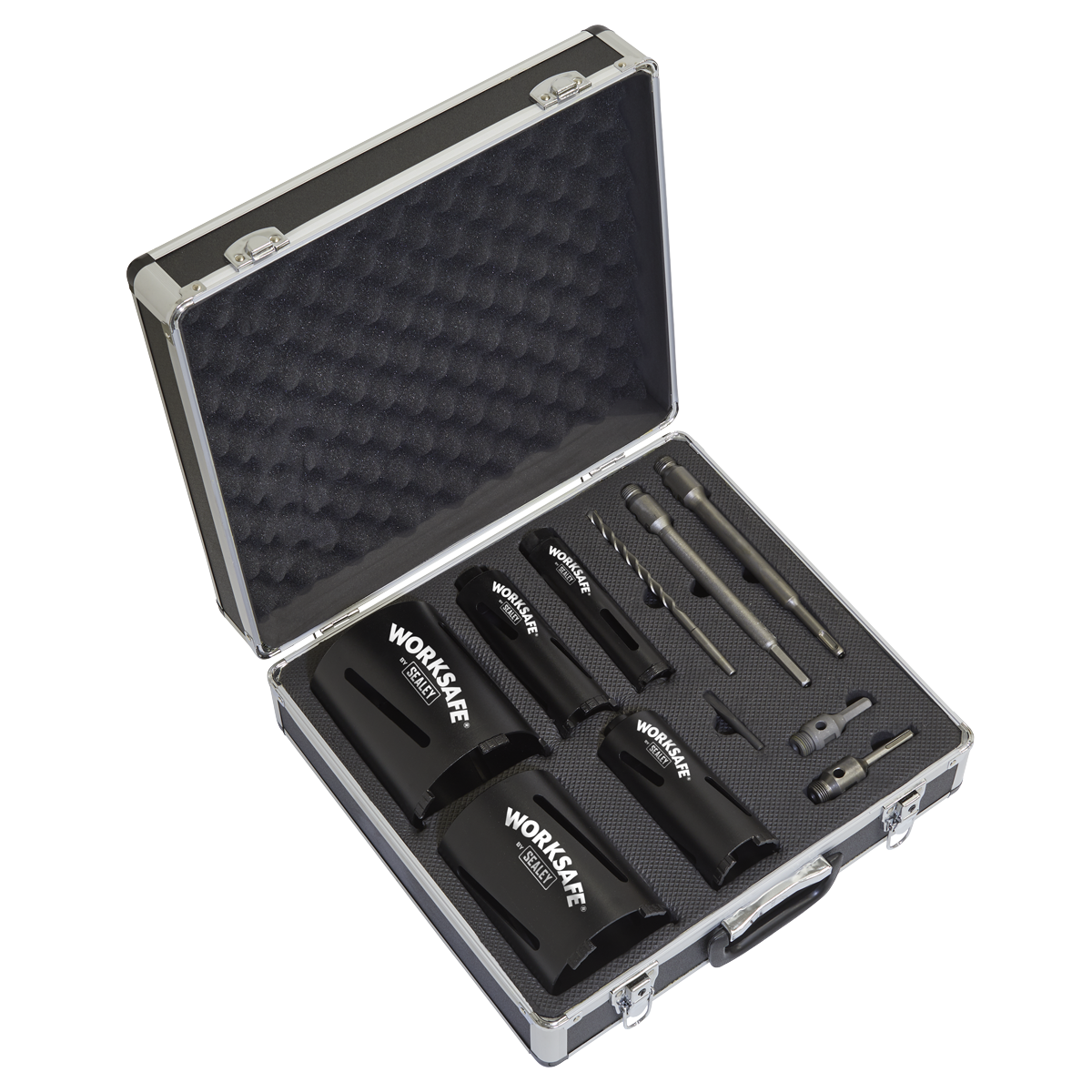 Contents: Diamond Cores; - Ø38, 52, 65, 117, 127mm, SDS Plus adaptors; 100, 300mm, Hex Adaptors; Ø13mm - 100, 300mm, 10mm ‘A-Taper’ Pilot, Extractor drift