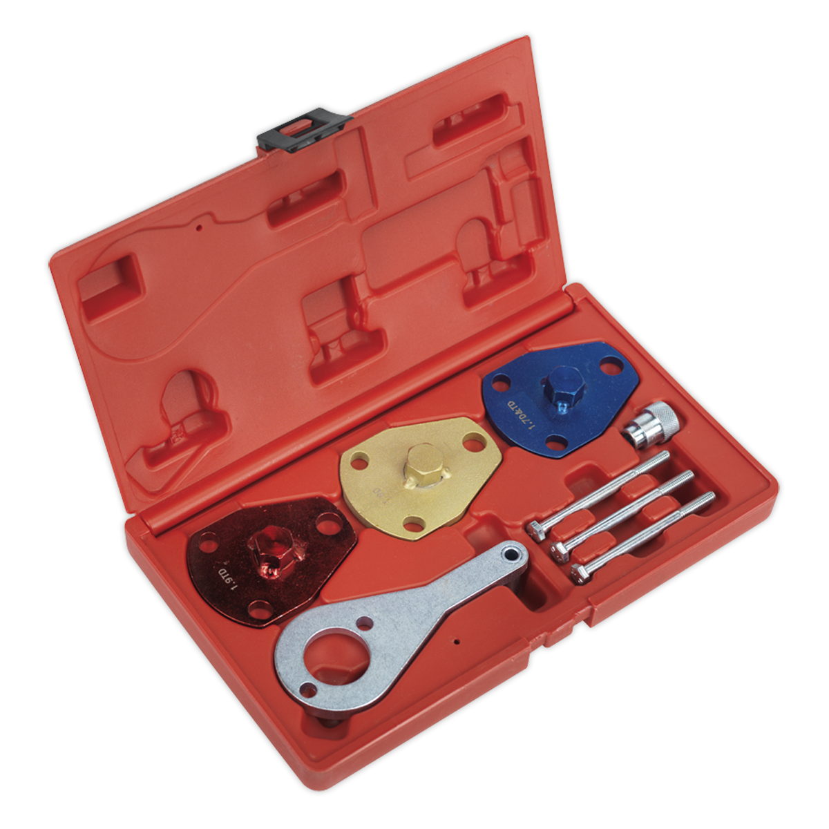 • Kit includes camshaft setting plates and crankshaft locking tool.