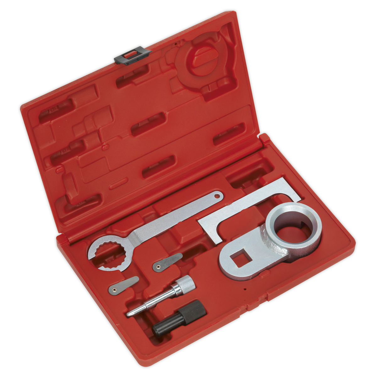 • Kit includes crankshaft pulley holding tool, camshaft setting plate, injection pump and crankshaft locking pins and tensioner adjuster.
