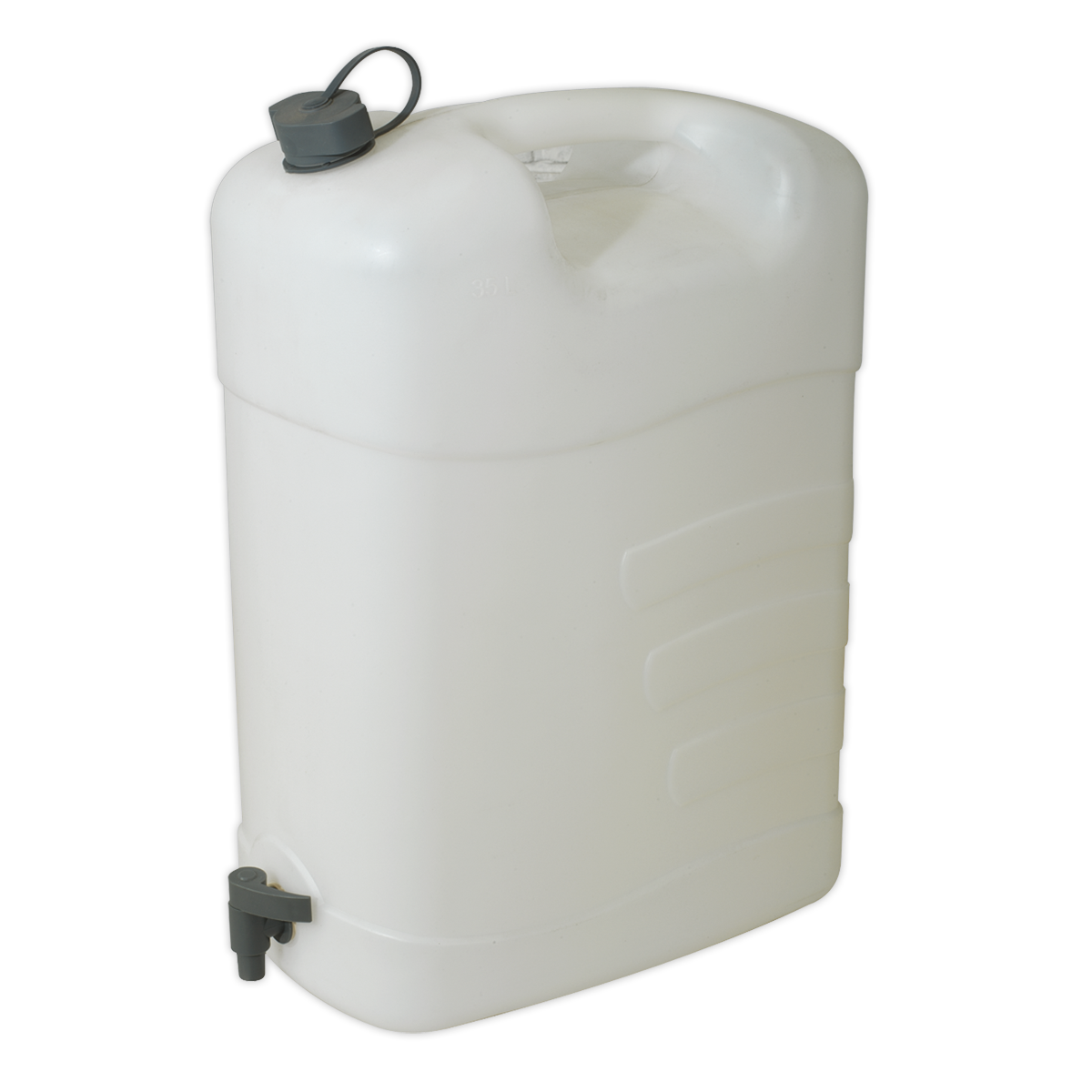 • 35L Polyethylene fluid container with attached screw cap and tap for easy fluid control.