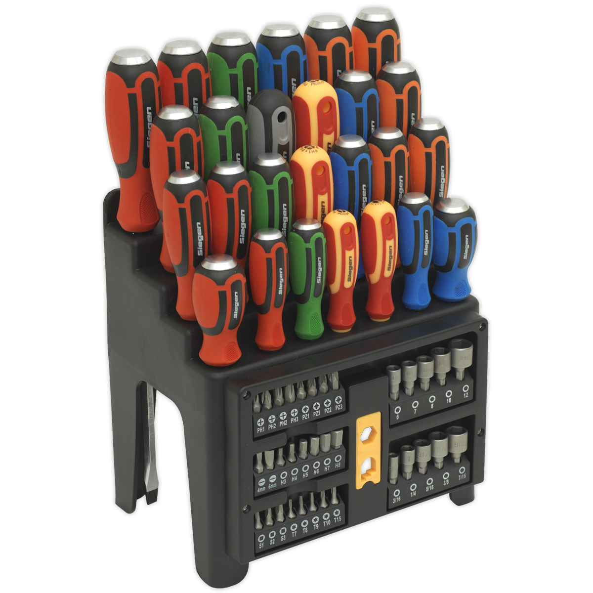 Contents: Screwdrivers; Slotted - 6 x 38, 3 x 75, 4 x 100, 5 x 100, 6 x 100, 6 x 150, 8 x 200mm, Phillips - #0 x 75, #2 x 38, #1 x 100, #2 x 100, #3 x 150mm, Pozi - #0 x 75, #1 x 100, #2 x 100, #3 x 150mm, VDE; Slotted - 3 x 75mm, Phillips - 0 x 75, 1 x 80, 2 x 100mm, TRX-Star* - T20 x 100, T25 x 100, T27 x 100, T30 x 125, T40 x 125mm, Bit Driver, 1/4"Hex Bits; TRX-Star* - T7, T8, T9, T10, T15, Slotted - 4, 6mm, Phillips - #1, #2 (x2), #3, Pozi - #1, #2 (x2), #3, Hex - 3, 4, 5, 6, 7, 8mm, Square - 1, 2, 3mm, Nut Drivers; Metric - 6, 7, 8, 10, 12mm, Imperial - 3/16", 1/4", 5/16", 3/8", 7/16", Magnetizer/Demagnetizer