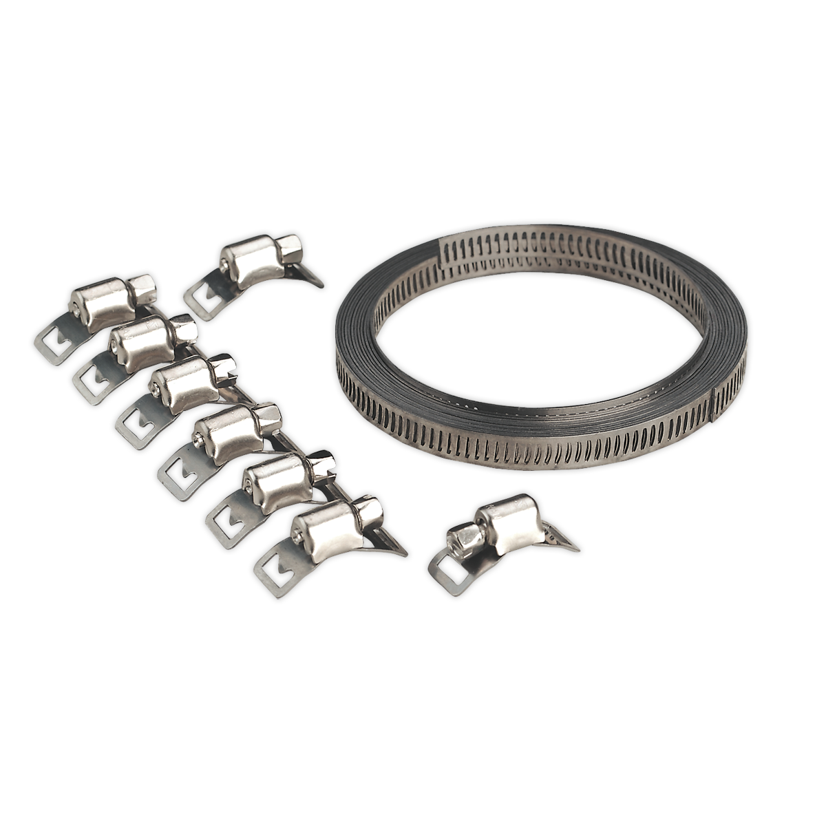 • Set includes a length of banding and a selection of worm drive tension clips.