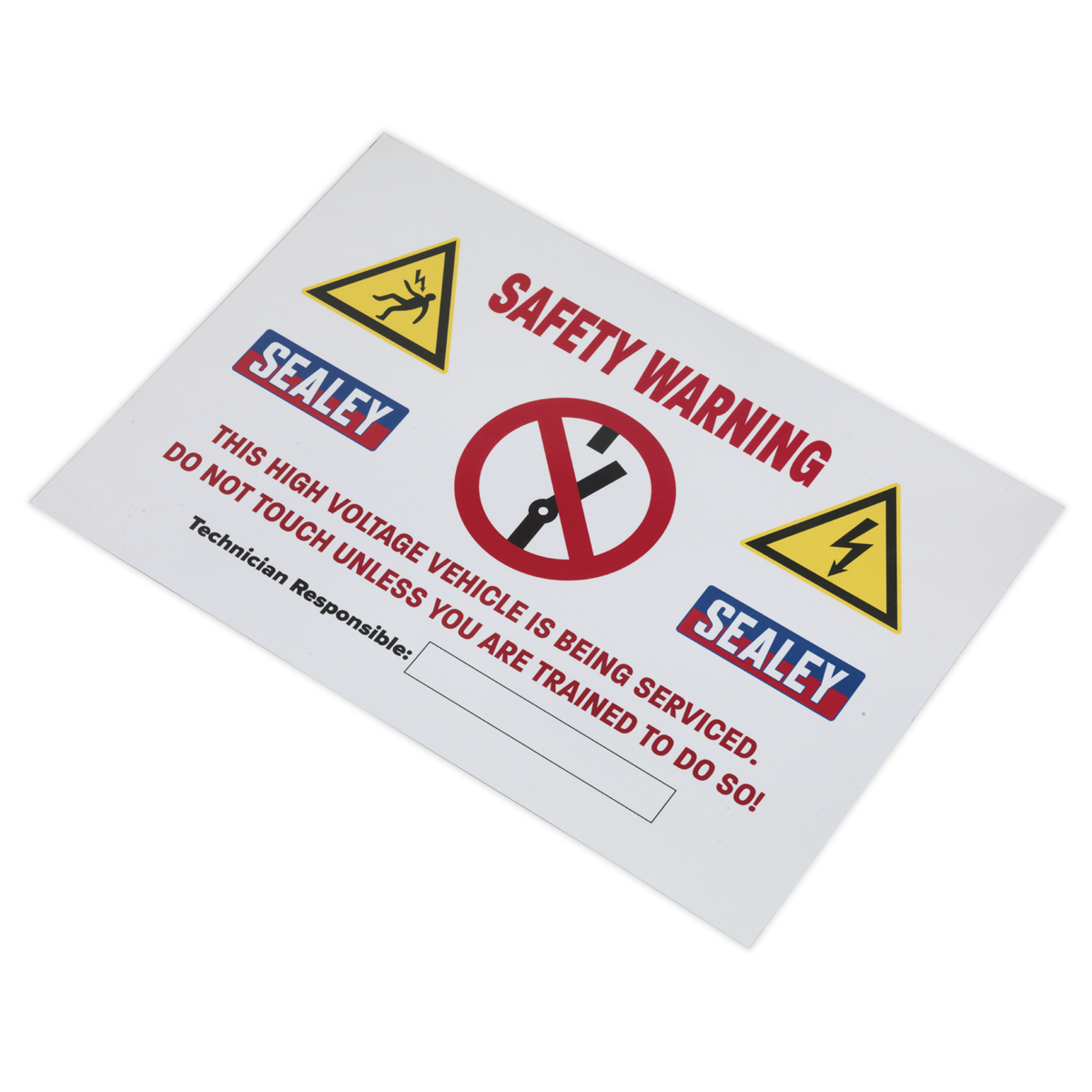 • Essential safety warning sign for placing on a hybrid or electric vehicle whilst service or repair operations are being carried out.