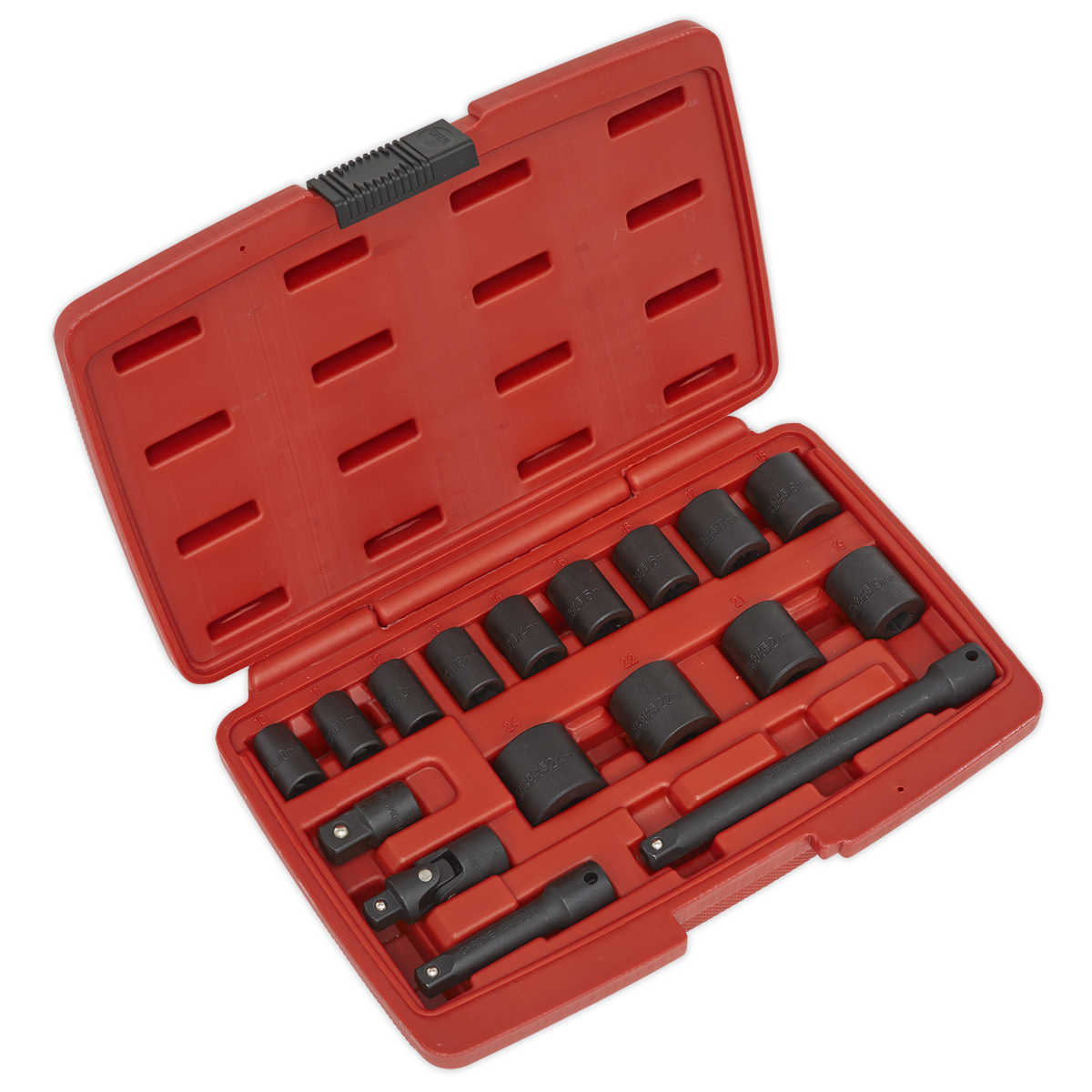Contents: Sockets; 10, 11, 12, 13, 14, 15, 16, 17, 18, 19, 21, 22, 24mm, Extension Bars; 75, 150mm, 3/8"Sq Drive Universal Joint, 3/8"Sq(F) x 1/2"Sq(M) Adaptor