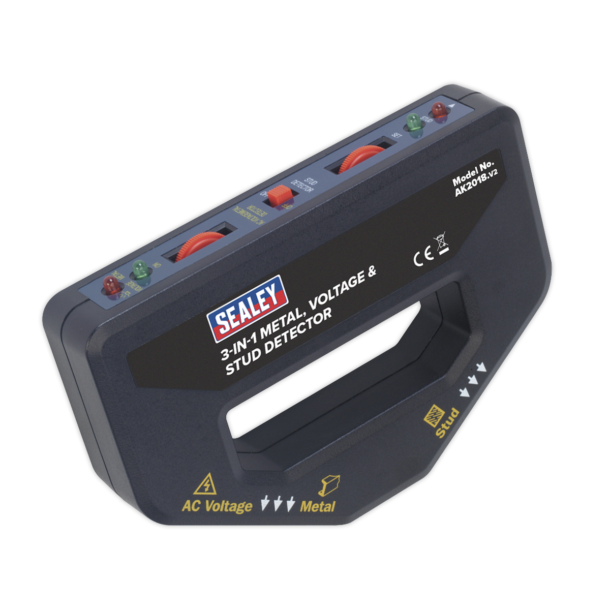• Powered by a 9V battery (supplied) the detector will, with a red and green LED display and an audible signal, show the presence of metal, electricity and wooden studs or battens.