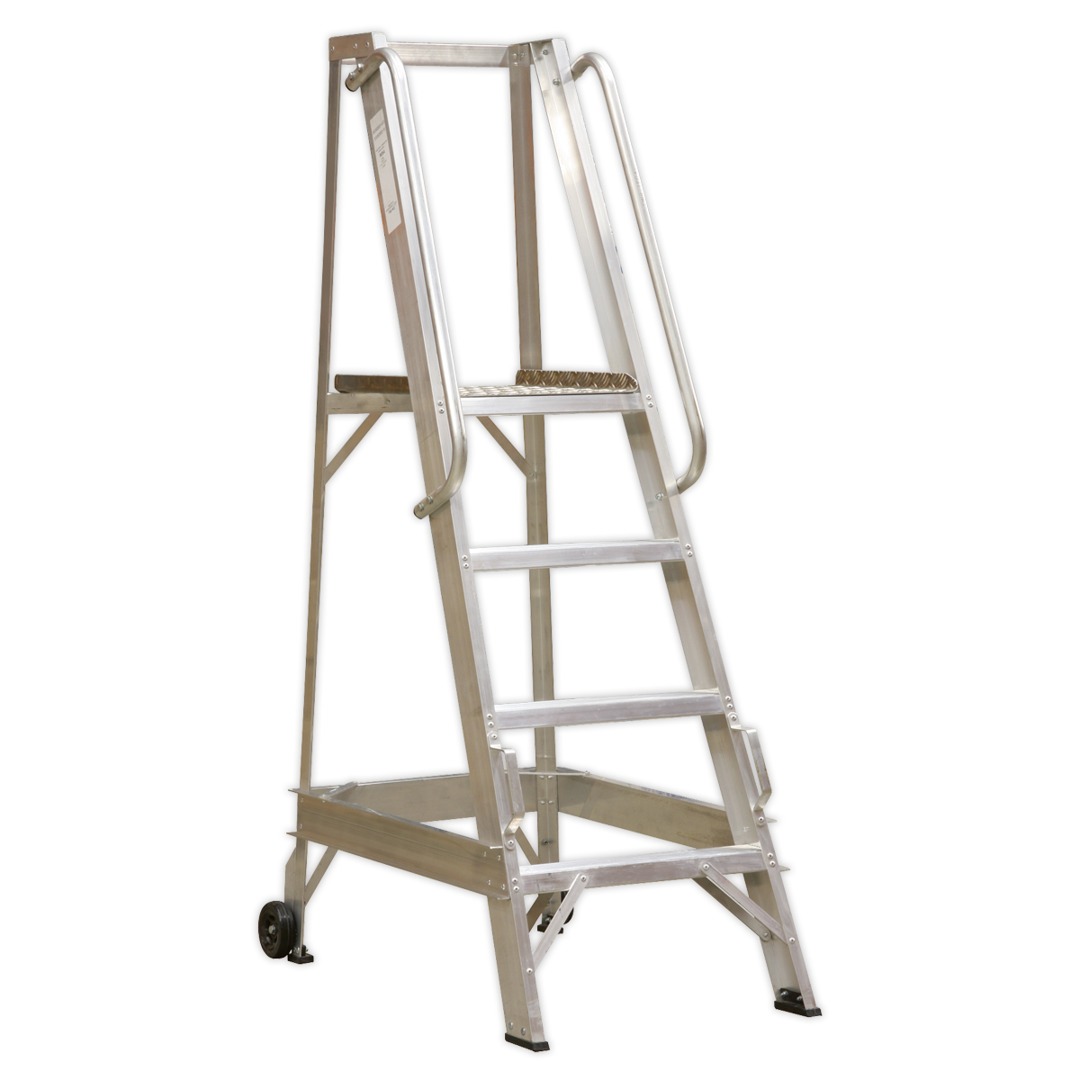 • Non-slip treads, safety hand rails and cross braced frame.